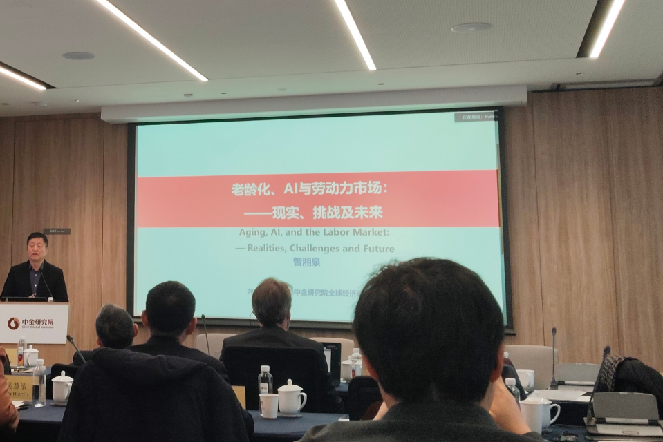 中国人民大学中国就业研究所所长、劳动人事学院教授曾湘泉应邀出席会议,并以“老龄化、ai与劳动力市场——现实、挑战及未来“为题发表演讲。