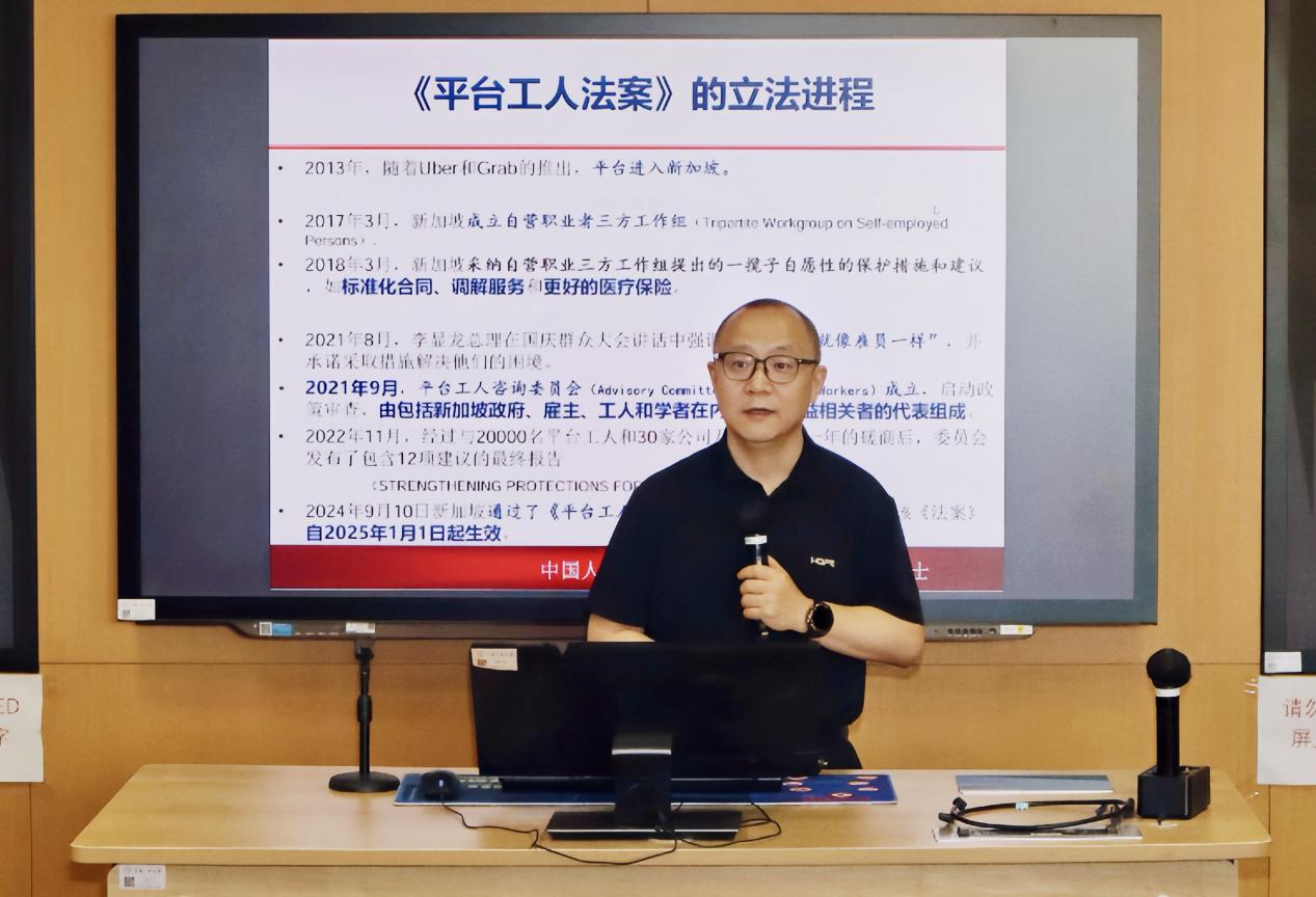 中国人民大学劳动人事学院唐鑛教授围绕新加坡《平台工人法案》的立法进程与核心内容,深入探讨了其对我国平台工人保护立法的借鉴意义。他首先介绍了新加坡《平台工人法案》的立法背景与进程,表示这一立法模式不仅平衡了平台经济的灵活性与工人权益的保障性,尤其在集体协商权益方面还为其他国家提供了重要参考。针对我国平台工人保护存在的三大突出问题——缺乏单独立法、身份界定标准不统一、现行劳动保障体系适配性不足,唐鑛教授提出要明确平台工人身份、单独立法探索以及构建权利保障体系。他强调,新加坡的实践经验表明,政府主导、多方参与的立法模式能够有效解决平台用工的争议问题。我国未来立法应注重灵活性与扩展性,初期可统一基础保障,后续逐步细化行业规则,以适应平台经济的动态发展。