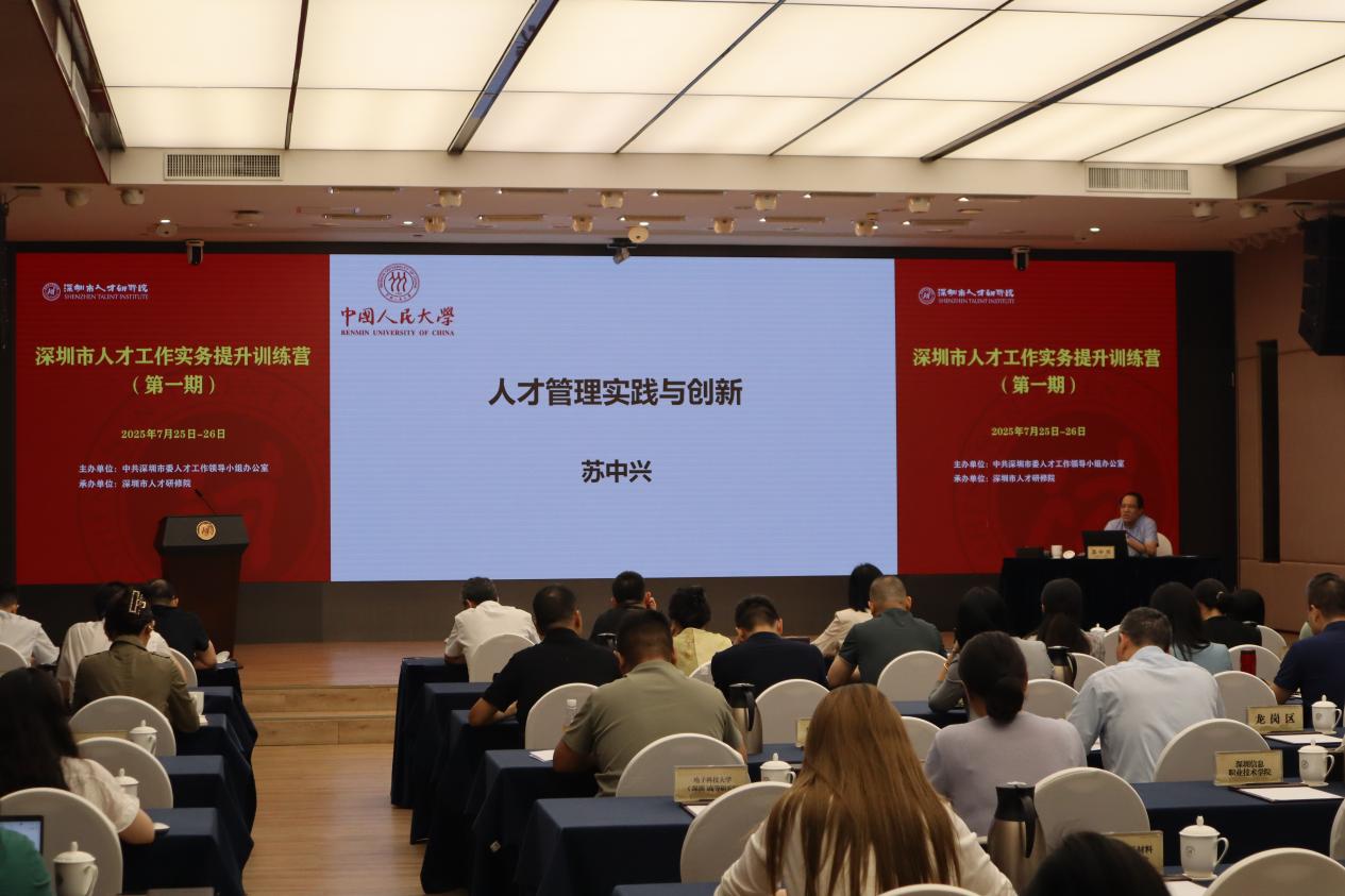 2025年7月25日,由深圳市委组织部、市人才工作局主办的深圳市人才工作实务提升训练营(第一期)开班。深圳市人才工作局局长罗冰作开班动员讲话,我院苏中兴教授应邀作开班第一讲,就人才管理实践与创新进行了全面讲解,市委人才工作领导小组成员单位40余家有关处室处长、副处长,各区组织部门分管副部长、人才局局长、人才科室负责人,深圳各高校、科研院所等人事部门有关负责同志,各区重点产业园区人才专员等150余人参加了此次培训。