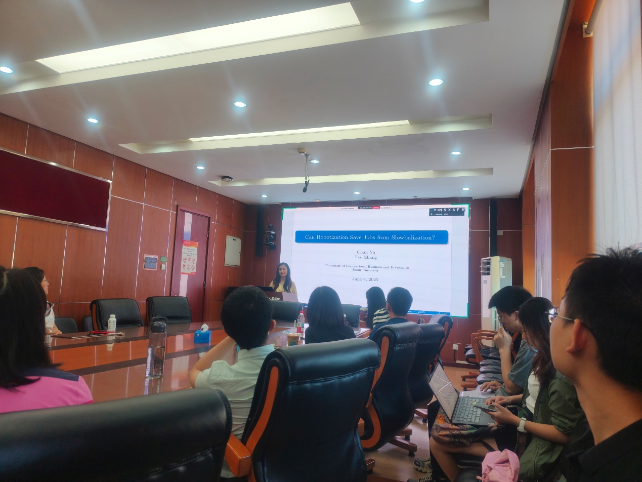 2025年6月4日下午,由劳动人事学院主办,劳动经济系和中国就业研究所承办的“劳动经济学双周论坛”第221期讲座在求是楼347会议室成功举办。来自对外经济贸易大学保险学院的喻婵副教授分享了主题为“can robots save jobs from slowbalization?”的研究。本次论坛由劳动人事学院王雪凝讲师主持,劳动人事学院赵忠教授、赵丽秋教授、王非副教授、陈轩副教授、翁茜副教授、邹先强副教授、林琳讲师、陈泽阳讲师、雷子腾讲师以及其他校内外师生参与了此次讲座。