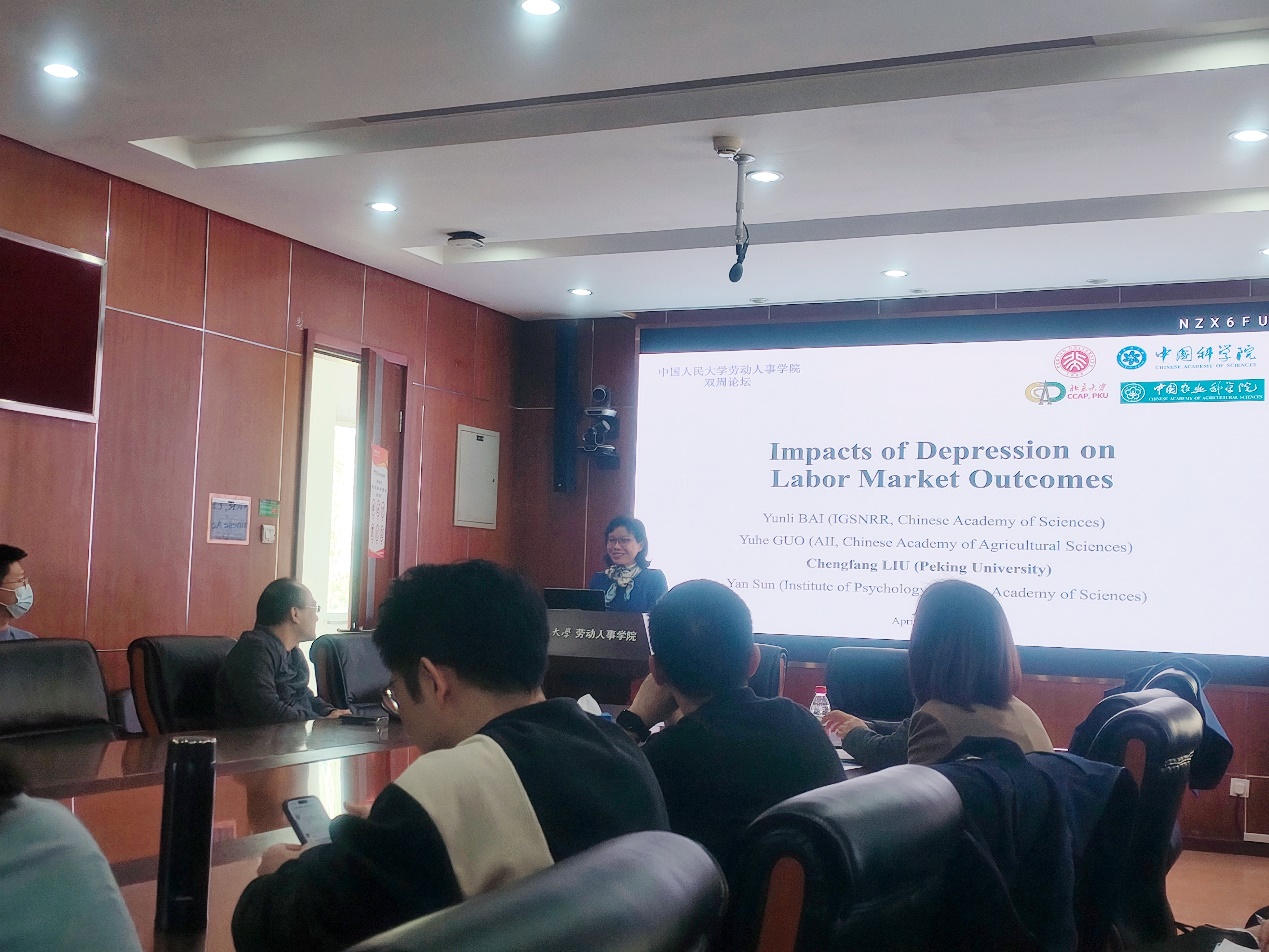 2025年4月2日下午,由劳动人事学院主办,劳动经济系和中国就业研究所承办的“劳动经济学双周论坛”第217期讲座在求是楼347会议室成功举办。来自北京大学现代农学院的刘承芳教授分享了主题为“impacts of depression on labor market outcomes”的研究。本次论坛由劳动人事学院赵丽秋教授主持,劳动人事学院赵忠教授、刘宏教授、王非副教授、陈轩副教授、邹先强副教授、李梦婷副教授、林琳讲师、陈泽阳讲师、王雪凝讲师,以及其他校内外师生参与了此次讲座。