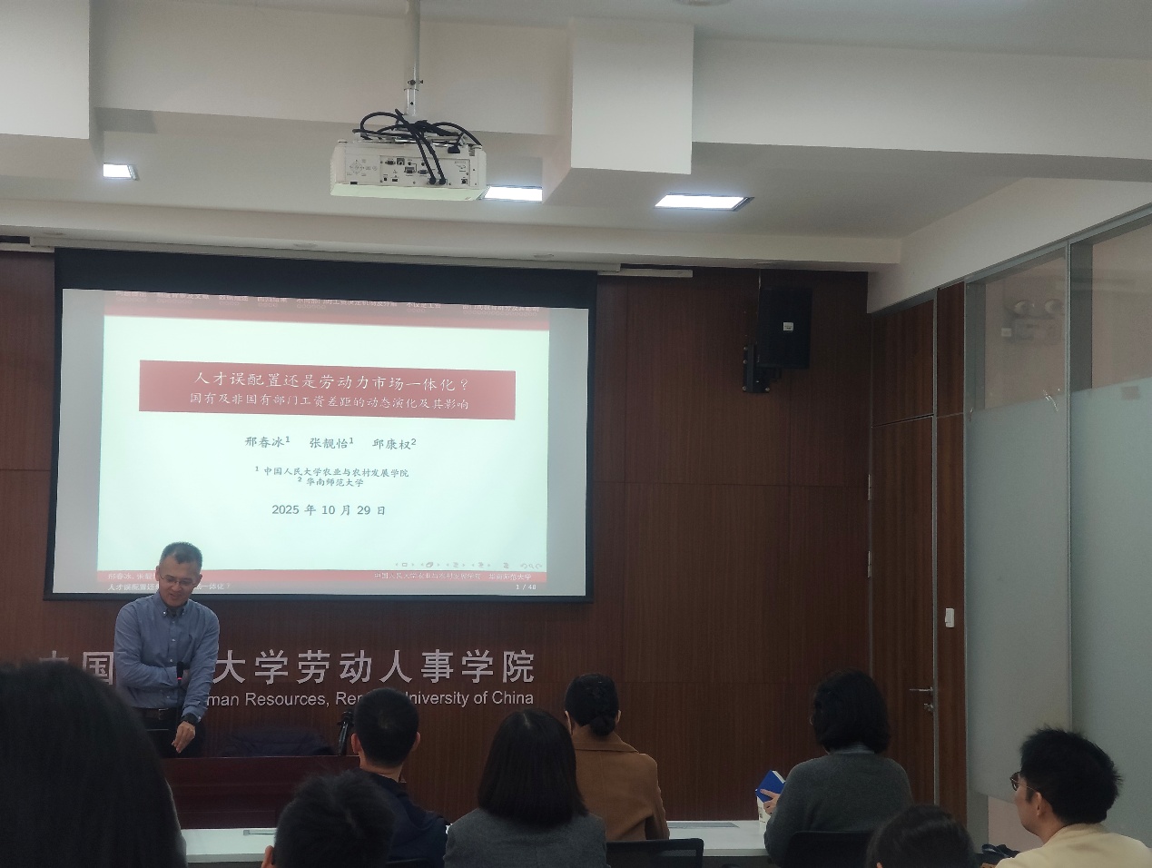 2025年10月29日下午,由劳动人事学院主办,劳动经济系和中国就业研究所承办的“劳动经济学双周论坛”第223期讲座在求是楼347会议室成功举办。来自中国人民大学农业与农村发展学院的邢春冰教授分享了主题为“人才误配置还是劳动力市场一体化?——国有与非国有部门工资差距的动态演变及其影响”的研究。本次论坛由劳动人事学院林琳讲师主持,劳动人事学院赵丽秋教授、王非副教授、邹先强副教授、王雪凝讲师、陈泽阳讲师、雷子腾讲师以及其他校内外师生参与了此次讲座。